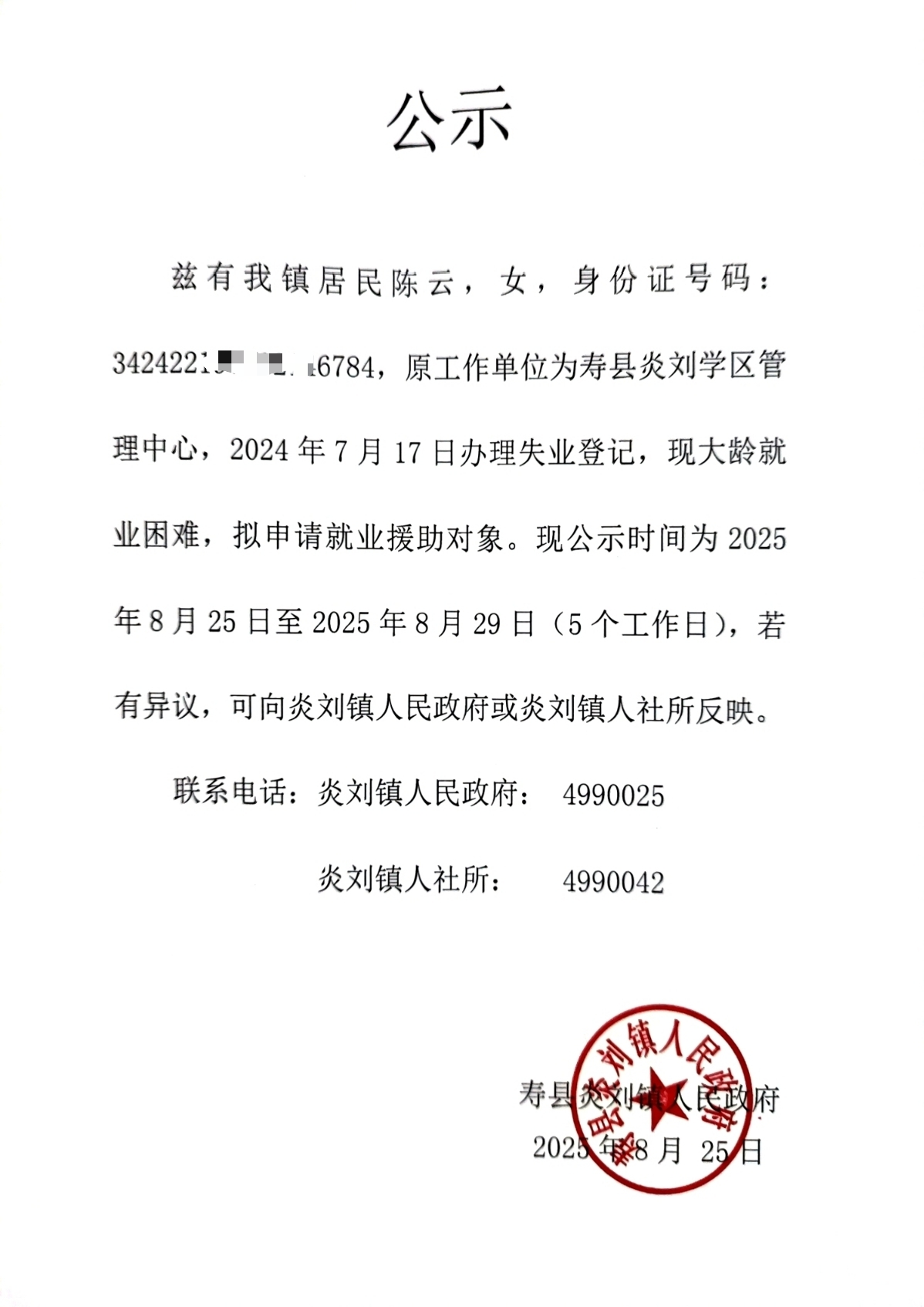 兹有我镇居民陈云,女,身份证号码:342422********6784,原工作单位为寿县炎刘学区管理中心,2024年7月17日办理失业登记,现大龄就业困难,拟申请就业援助对象。现公示时间为2025年8月25日至2025年8月29日(5个工作日),若有异议,可向炎刘镇人民政府或炎刘镇人社所反映。