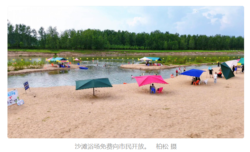 清晨,微风不燥,游客在河边沙滩打卡留念;傍晚,热浪消退,大家便换上泳衣,在淠河湾里尽情嬉戏。入夏以来,每日游客量接近万人,到了周末,更是攀升至两三万之多。当夜幕降临,志愿者便会疏导游客有序离场。