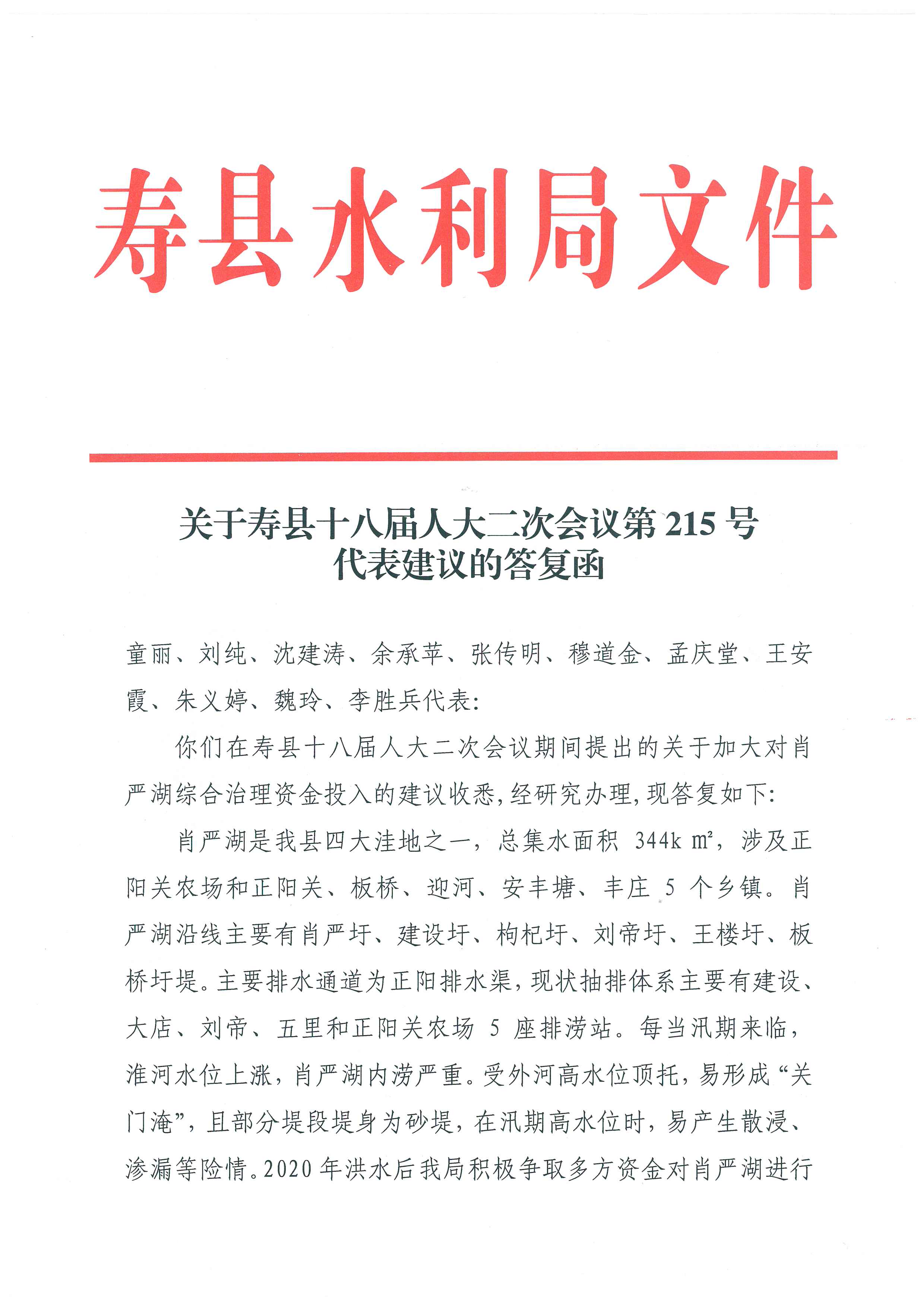 关于寿县十八届人大二次会议第215号代表建议的答复函