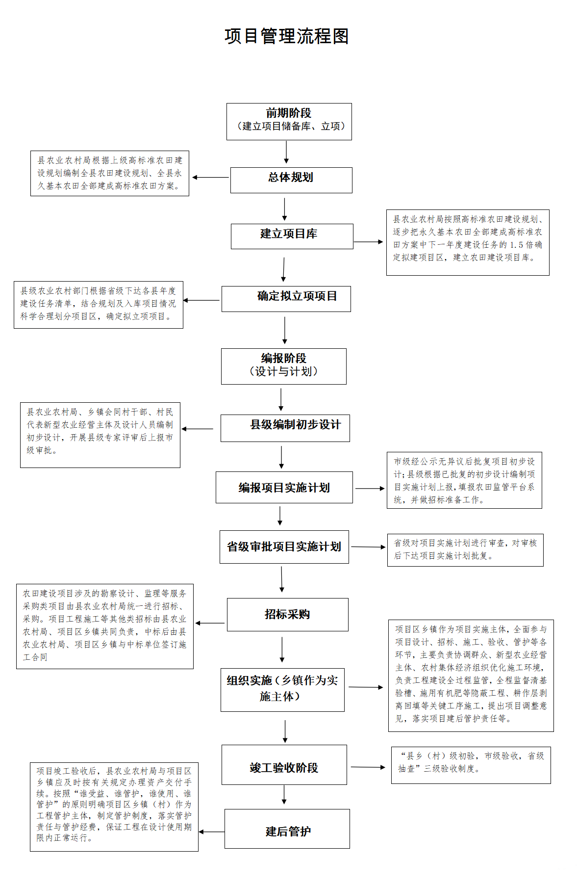 项目建设乡镇:与县农业农村局共同作为项目法人和业主单位,对高标准农田建设质量负总责,成立工作专班,共同组织项目设计、招标、施工、初步验收、后续管护等各环节;共同负责招标、采购活动和合同签约管理,监督施工单位严格按投标承诺和合同约定实施。负责向项目区内群众、新型农业经营主体、农村集体经济组织广泛宣传政策、征集建设需求;组织开展耕地后备资源及现状制约因素调查,组织有资质的技术单位编制项目建议书(达到可行性研究深度)或可行性研究报告,报县进入项目储备库;协助设计单位开展实地勘测、编制项目初步设计,参与项目评审论证;明确涉农站所项目建设管理职责;协调群众、新型农业经营主体、农村集体经济组织优化施工环境,参与工程建设全过程监管,提出项目设计调整变更申请;参与项目县级初验,接收竣工验收合格工程;负责落实项目建后管护等工作。积极配合相关部门开展的的专项审计和监督检查,发现问题及时督促整改到位。
