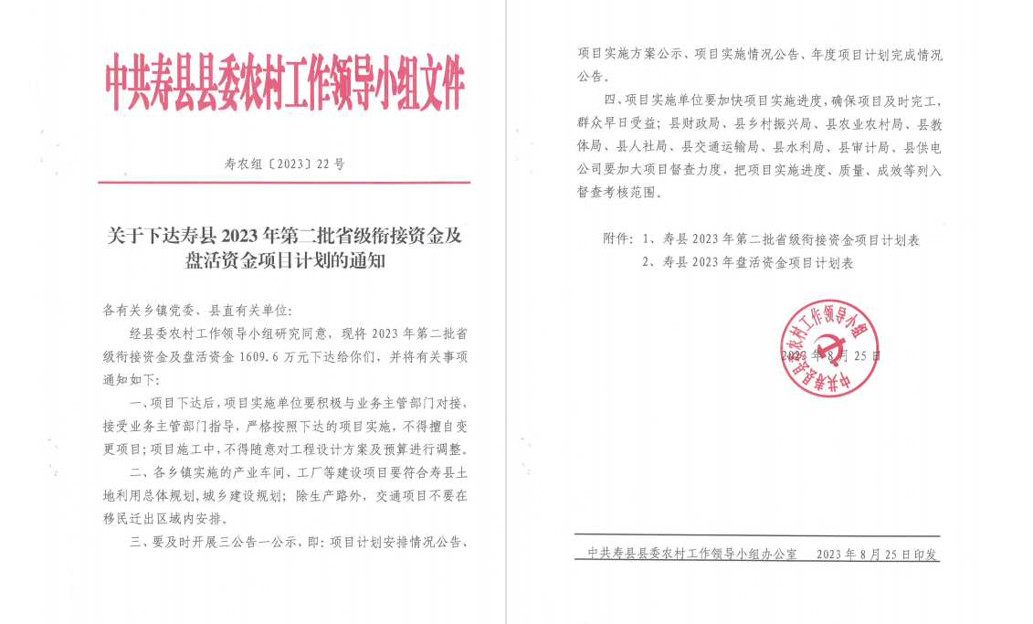 关于下达寿县2023年第二批省级衔接资金及盘活资金项目计划的通知