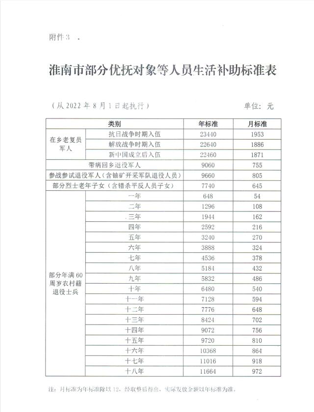 2025年淮南市部分优抚对象等人员生活补助标准