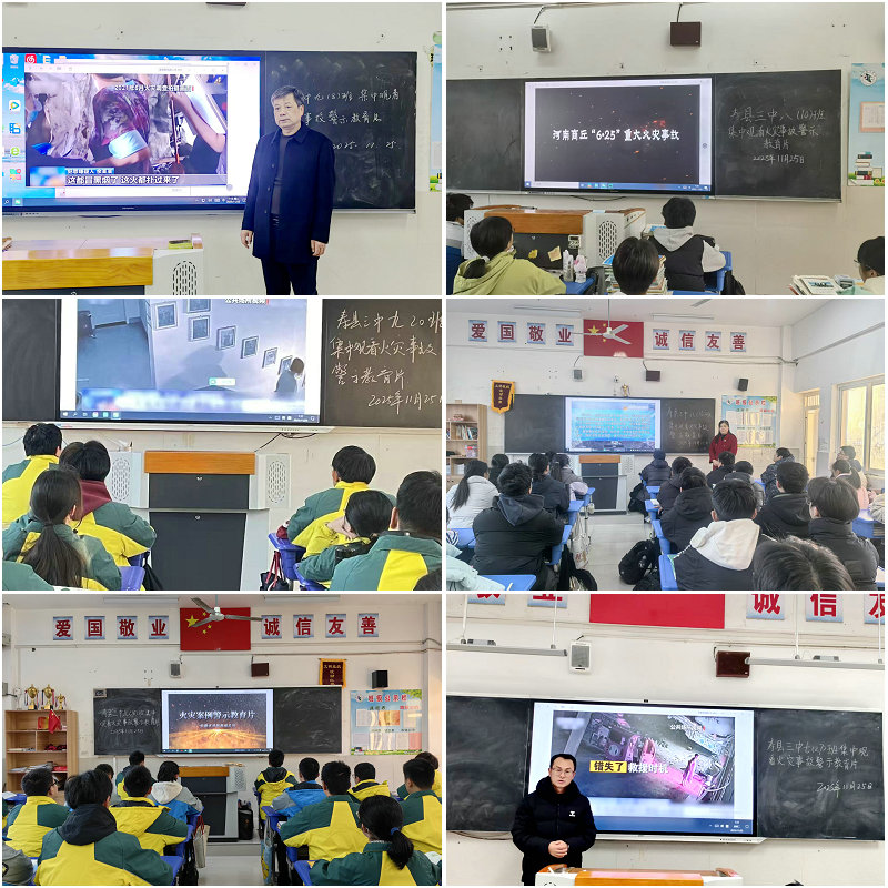在全国“消防安全月”来临之际,为深入贯彻“全民消防、生命至上”的安全理念,切实筑牢校园消防安全防线,提升师生消防安全意识和应急避险能力,寿县三中精心组织全校师生集中观看火灾事故警示教育片,以真实案例敲响安全警钟,让消防安全知识入脑入心。
