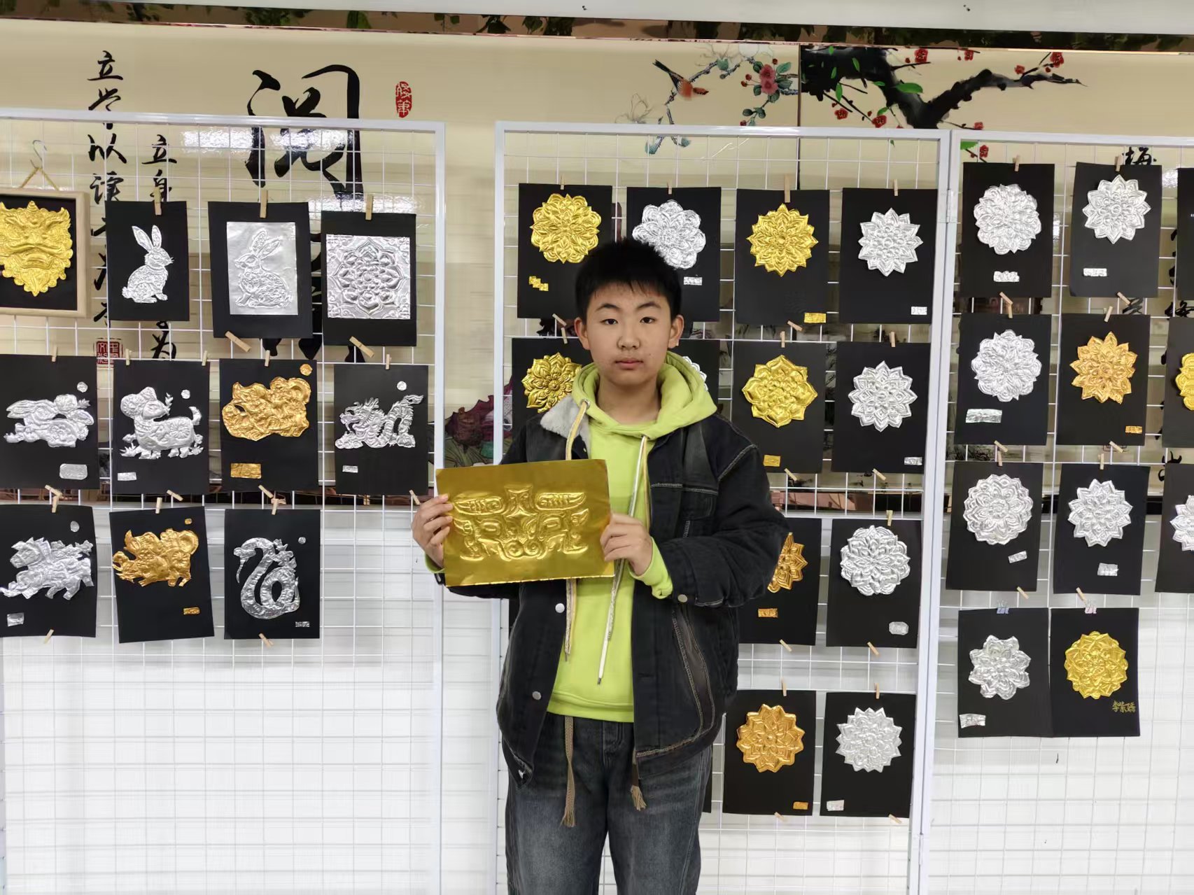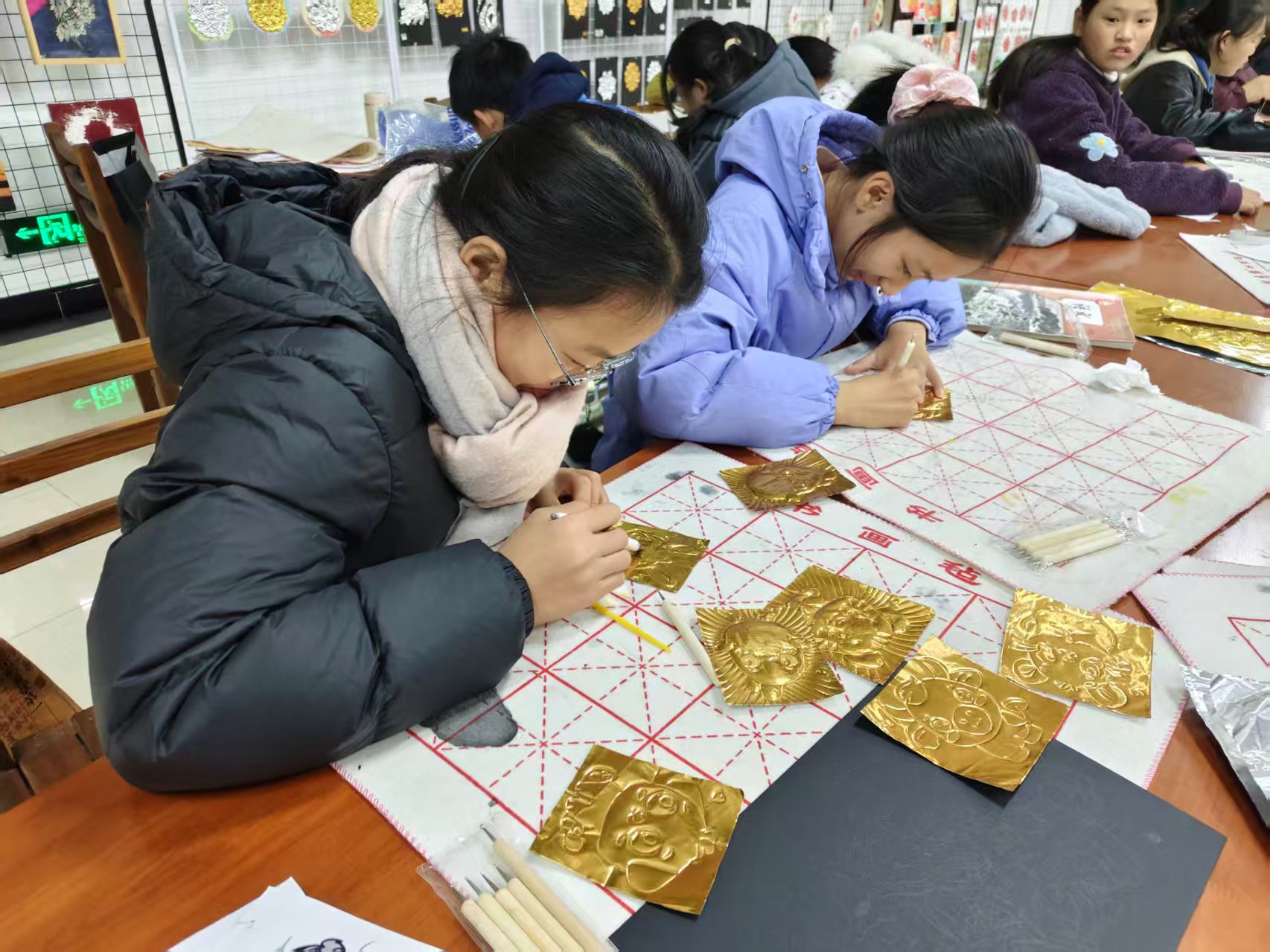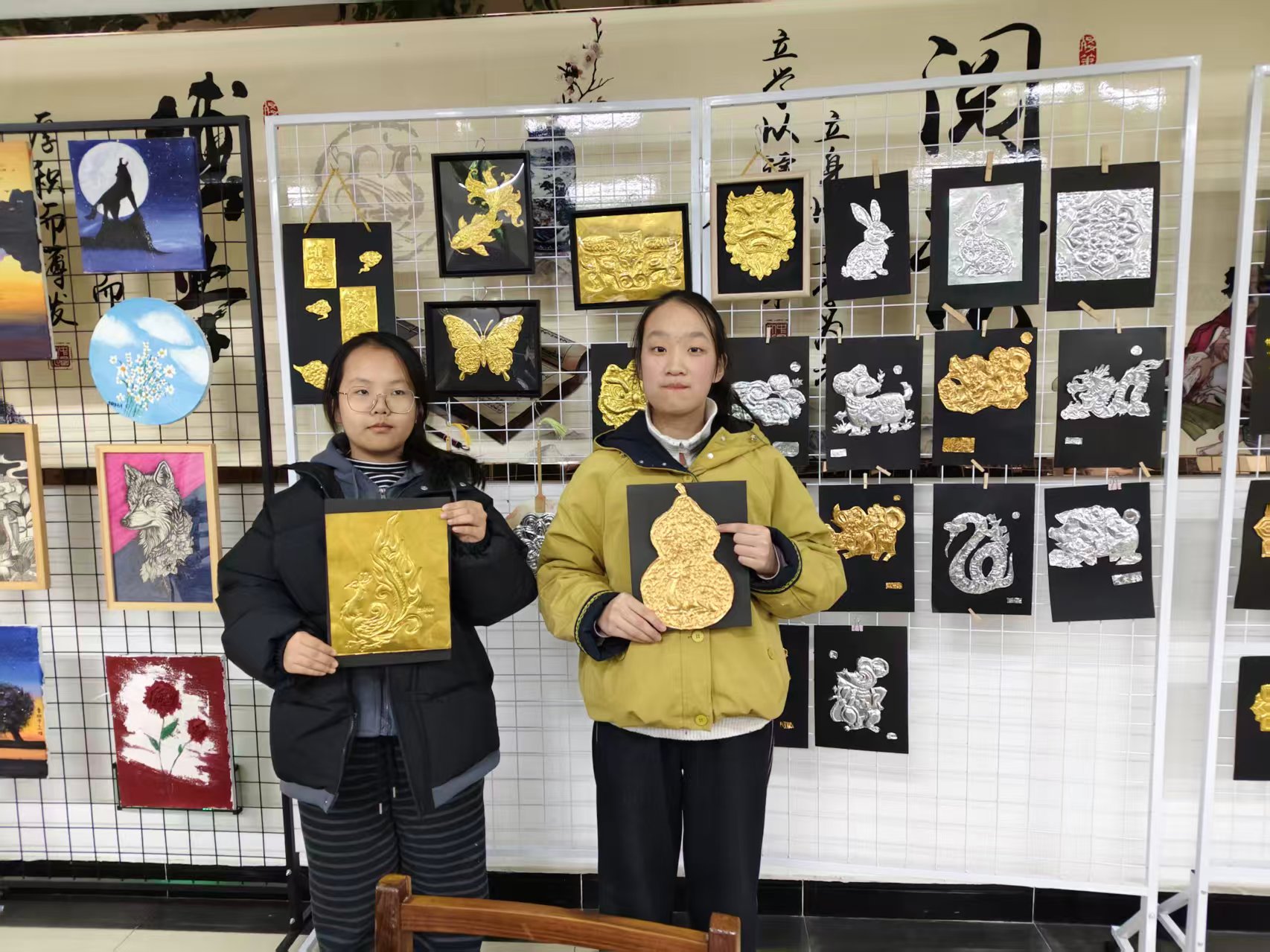 自社团成立以来,李老师带着同学们从基础刀法练起,更带队走访非遗传承人,深耕传统纹样的同时融入现代审美。社员们不仅熟练掌握 “勾、刻、压、剪” 核心技法,更在创作中读懂了非遗背后的文化密码。“每一道刻痕都像在和历史对话。” 七年级社员捧着刚完成的《瑞兽》《葫芦》作品说道,锡纸的金属质感让传统纹样更显灵动鲜活。