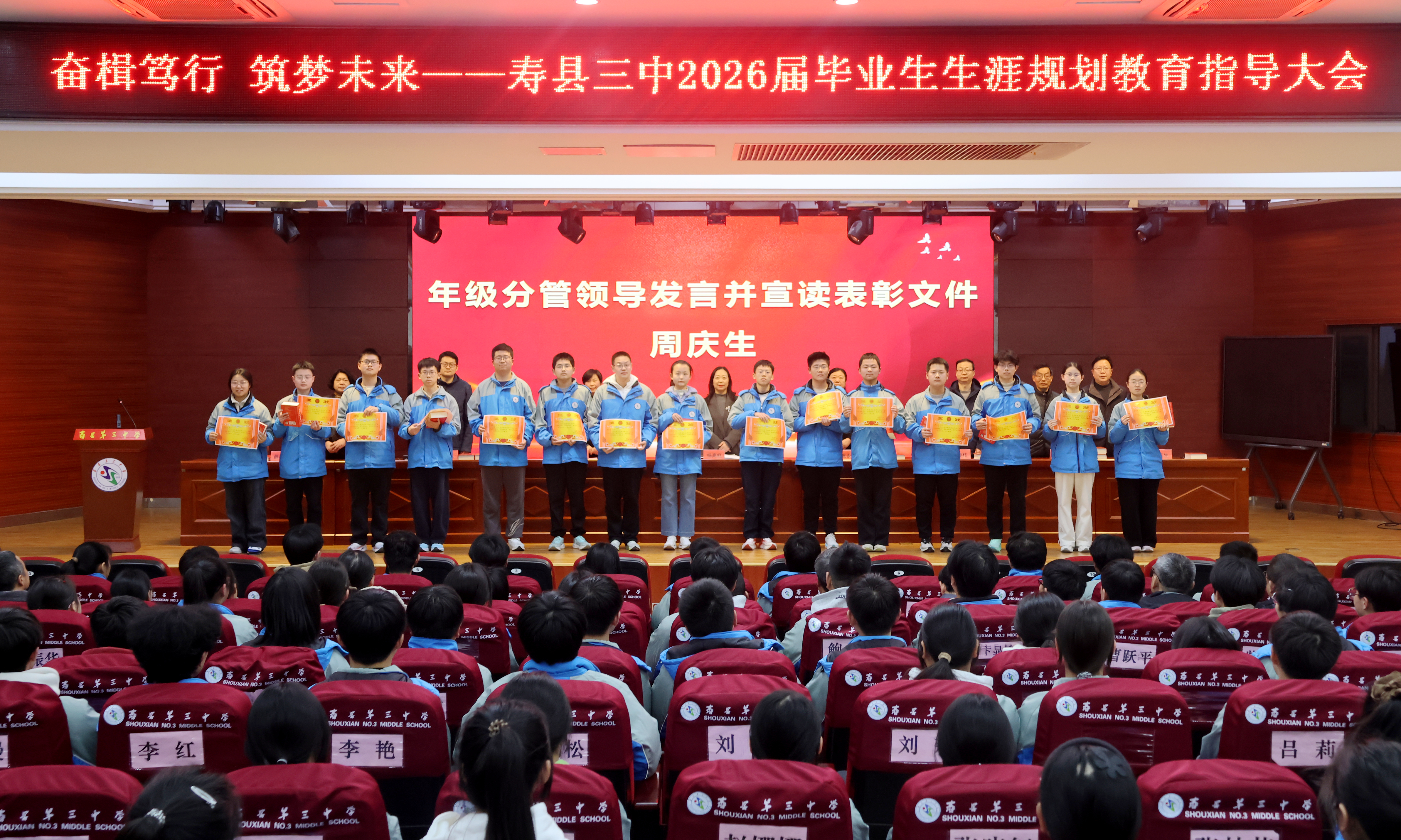 此次生涯规划教育指导大会,既是一场青春圆梦的动员令,更是一次逐梦的冲锋号,不仅为学子们明晰了生涯规划的方向,更点燃了大家拼搏奋进的斗志。道阻且长,行则将至;行而不辍,未来可期。相信寿县三中2026届九年级全体学子,必将以此次大会为契机,凝心聚力、笃行实干,以科学的规划、坚定的信念、不懈的拼搏,在六月的考场上笔尖生花、金榜题名,用优异的成绩书写青春华章,为母校争光添彩!