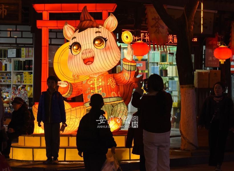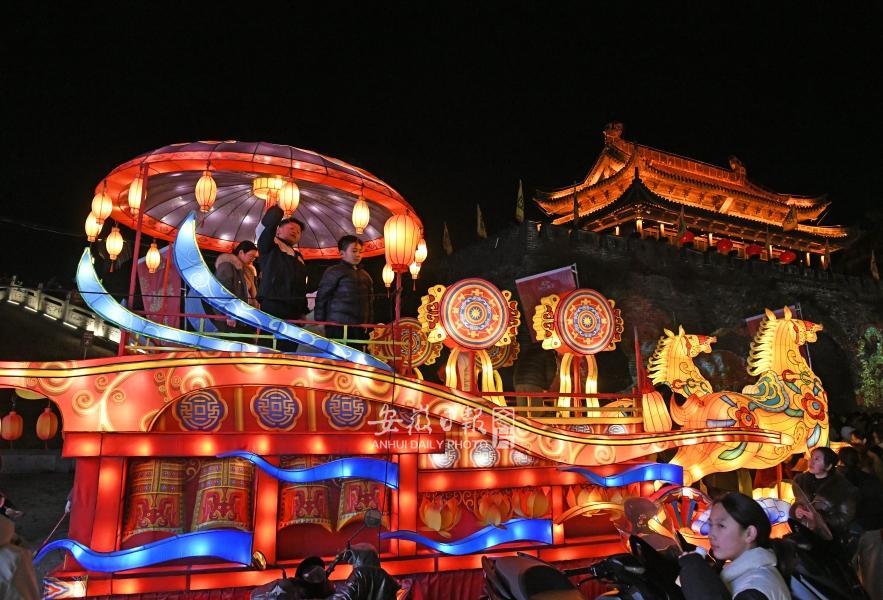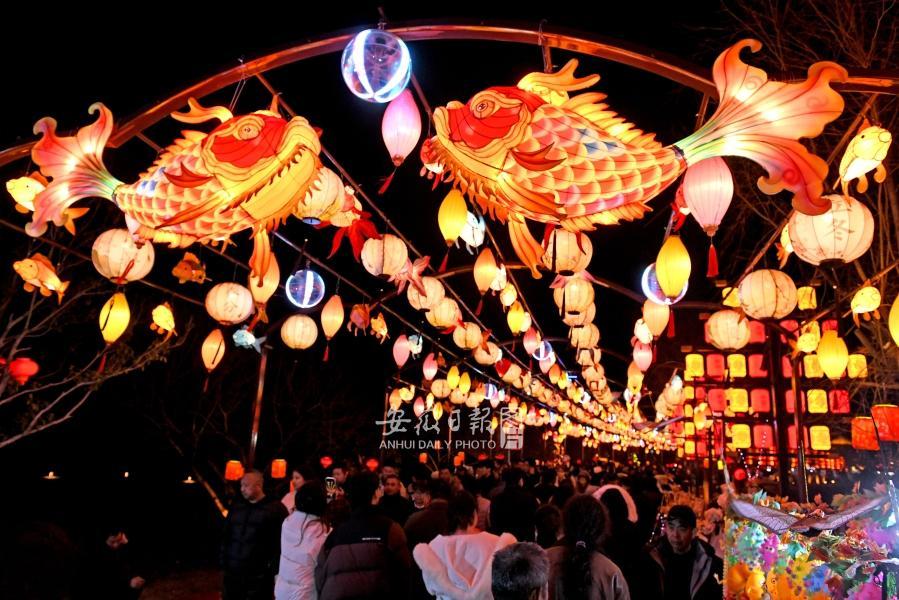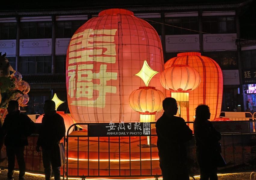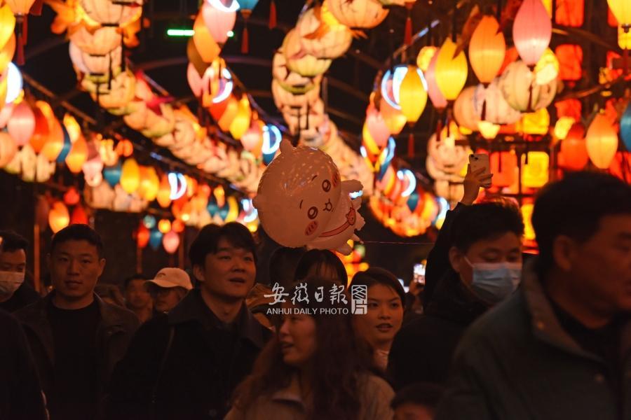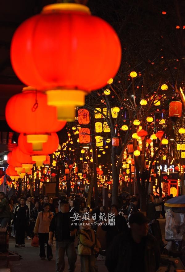 2月20日,游客在安徽省淮南市寿县古城赏灯。春节期间,淮南市寿县古城夜色在各类彩灯装饰下流光溢彩,营造出喜庆祥和的新春佳节氛围,吸引各地游客逛古城、品美食、赏美景。