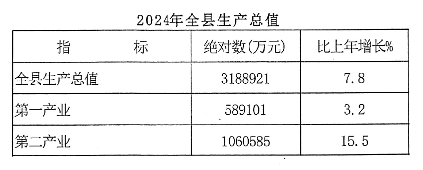 初步统计,全年全县实现地区生产总值318.9亿元,按可比价计算,比去年同期增长7.8%,增幅比上年同期增长0.6个百分点。