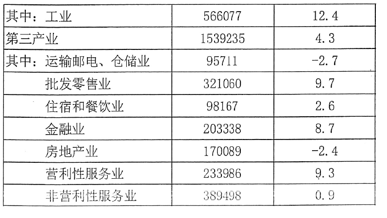 初步核算,全年地区生产总值[3](GDP)318.9亿元,按可比价格计算,比上年增长7.8%。分产业看,第一产业增加值58.9亿元,同比增长3.2%;第二产业增加值106.1亿元,同比增长15.5%;第三产业增加值153.9亿元,同比增长4.3%。三次产业结构[4]由上年的19.8:32.0:48.2调整为18.4:33.3:48.3,其中工业增加值占GDP的比重为17.8%。按常住人口计算,人均地区生产总值38264元(折合5325美元),比上年增长7.5%。