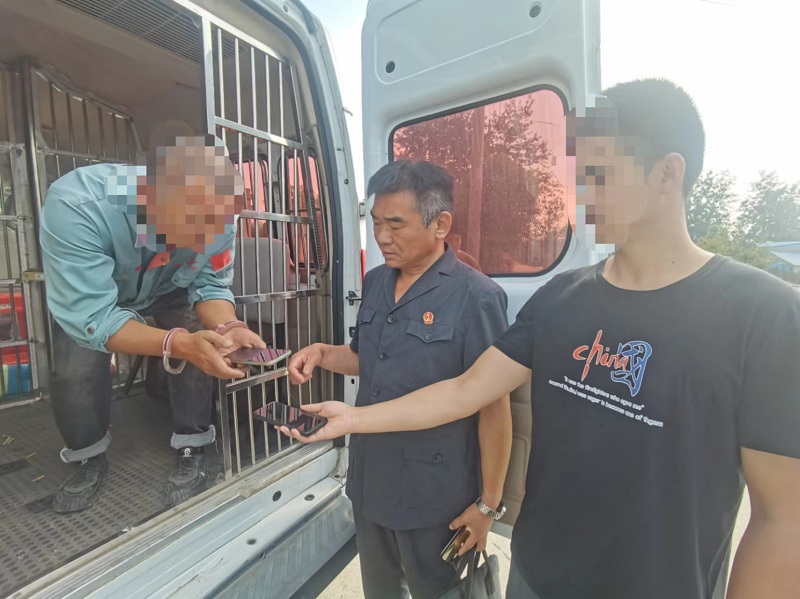 执行法官了解到这一情况后,第一时间制定执行方案,将被执行人曹某列入到集中行动强制拘留的名单中。上午9点40分左右,一路辗转的执行一组三辆警车在老唐父子俩的配合下,终于在狭窄的乡村小路上,将骑着三轮车运东西回家的被执行人曹某截停。冰冷的手铐刚带上,这个不守诚信的曹某也跟着慌了起来,押上警车就嚷嚷着要还钱。为了及时兑现申请人权益,法官临时就站在路边和老唐父子俩算起了本息。最后曹某通过电话联系亲属筹得20105元,蹲在囚车上将钱微信转给了小唐。