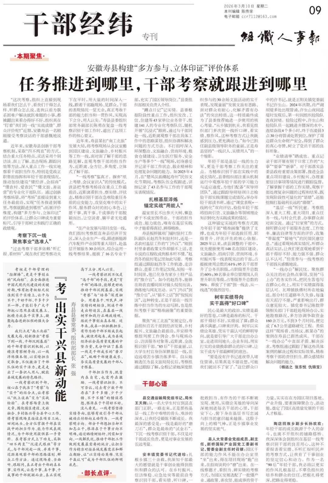3月10日,《组织人事报》刊发《安徽寿县构建“多方参与、立体印证”评价体系 任务推进到哪里,干部考察就跟进到哪里》一文,详情如下。