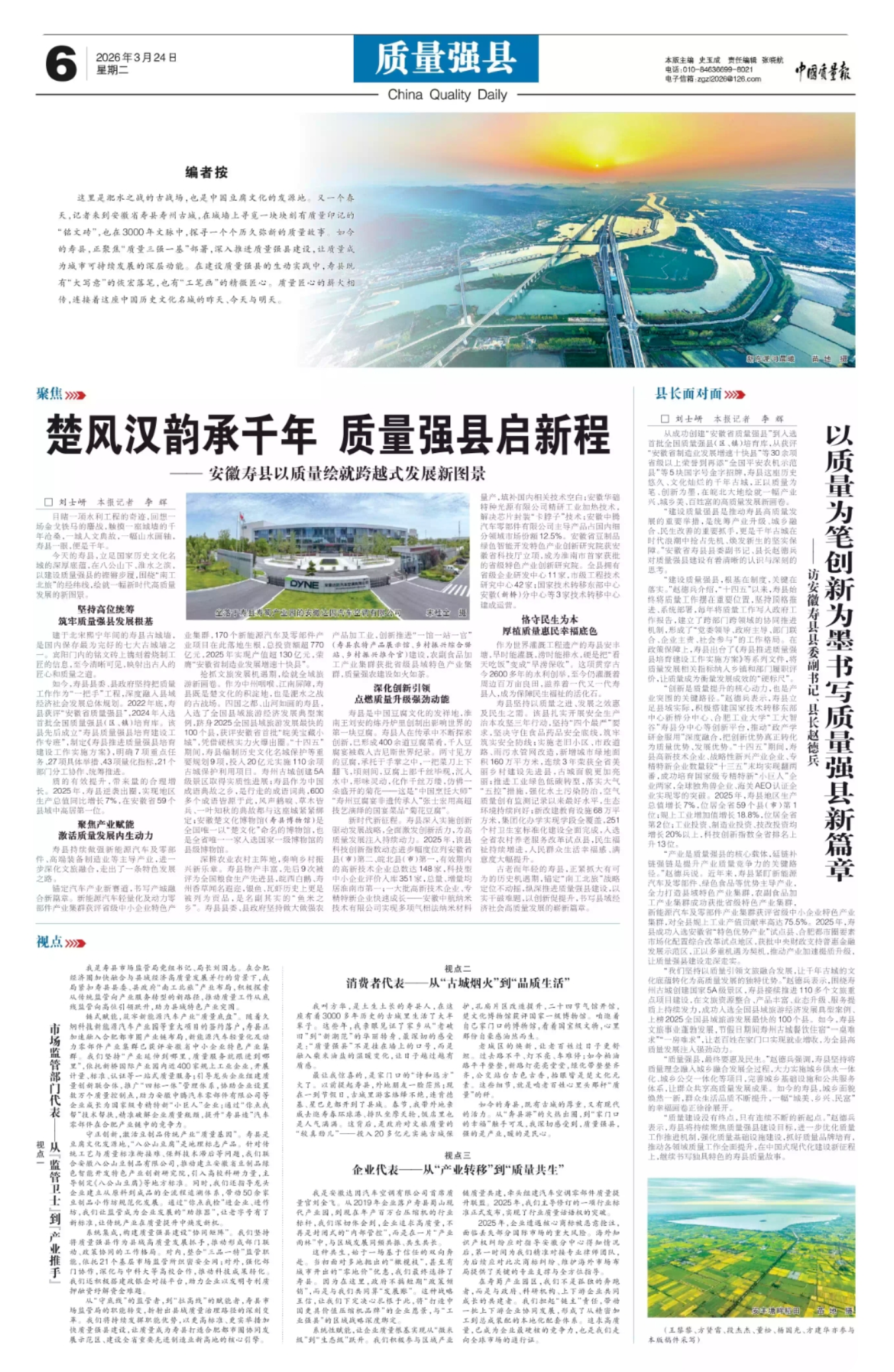 “建设质量强县是推动寿县高质量发展的重要举措,是统筹产业升级、城乡融合、民生改善的重要抓手,更是千年古城在时代浪潮中抢占先机、焕发新生的坚实保障。”安徽省寿县县委副书记、县长赵德兵对质量强县建设有着清晰的认识与深刻的思考。