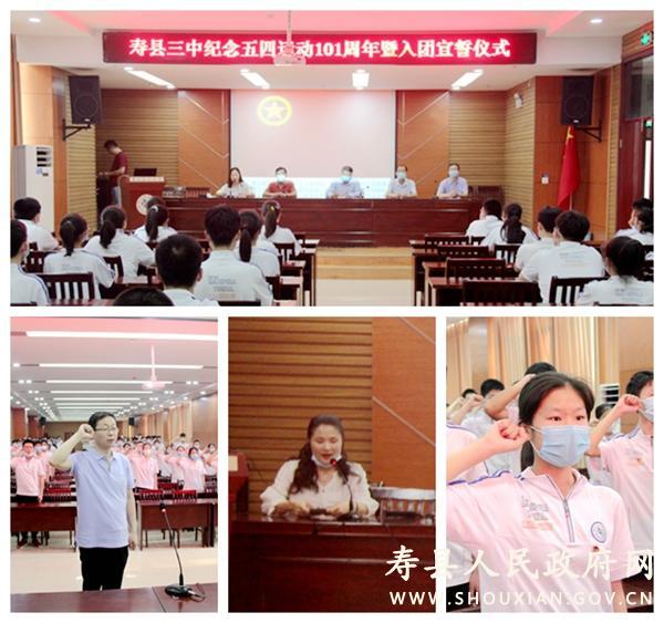 5月4日下午4:00, 寿县三中举行纪念五四运动101周年暨新团员入团宣誓仪式新团员齐唱团歌,并进行庄严的宣誓。通过此次系列活动的开展,激发了广大团员青年的荣誉感、责任感、归属感和使命感,增强了团队意识,坚定了理想信念。按照习近平总书记对新时代中国青年提出的要求,继承和发扬五四精神,练就过硬本领,投身强国伟业,用奋斗的青春为民族的复兴和国家的繁荣强盛贡献力量。