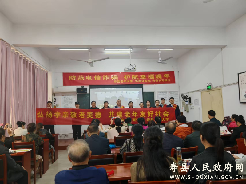 10月16日下午,寿县老年大学联合寿县公安局、寿县农商银行走进寿县老年大学,为老年朋友们送上一份贴心的“反诈礼包”。