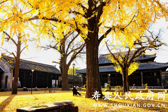 国家历史文化名城安徽省寿县位于八公山麓,淮河南岸,古城内的千年古树众多,古树饱经沧桑,依然枝繁叶茂,苍翠浓郁。其中,城内东北隅的报恩禅寺,西大街的孔庙,西南隅的清真寺,共有11株“国宝级”的银杏。银杏叶在初冬的暖阳下熠熠生辉,绽放出迷人的光芒。微风轻拂,飘动而落的树叶,宛如金色的蝴蝶在空中翩翩起舞,为古朴的石板路和灰瓦屋披上了一层金色的华毯,为古城增添了几分温馨与生机,游走观景,犹如步步“踏金”,怡然自得。