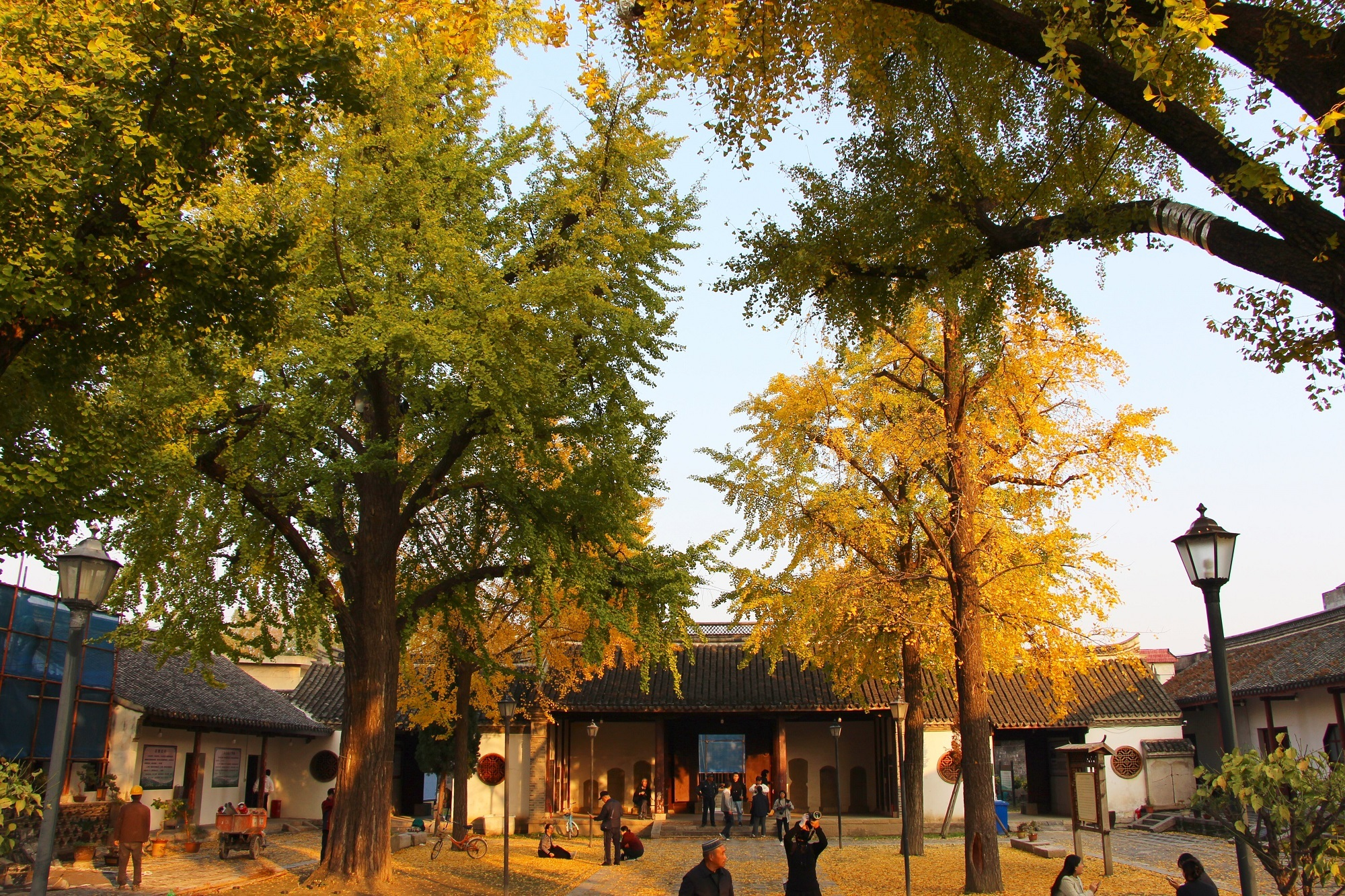 国家历史文化名城安徽省寿县位于八公山麓,淮河南岸,古城内的千年的古树众多,古树饱经沧桑,依然枝繁叶茂,浓郁苍翠。其中,城内东北隅的报恩禅寺,西大街的孔庙,西南隅的清真寺,共有11株“国宝级”的银杏。银杏叶在初冬的暖阳下熠熠生辉,绽放出迷人的光芒。微风轻拂,飘动而落的树叶,宛如金色的蝴蝶在空中翩翩起舞,为古朴的石板路和灰瓦屋披上了一层金色的华毯,为古城增添了几分温馨与生机,游走观景,犹如步步“踏金”,怡然自得。