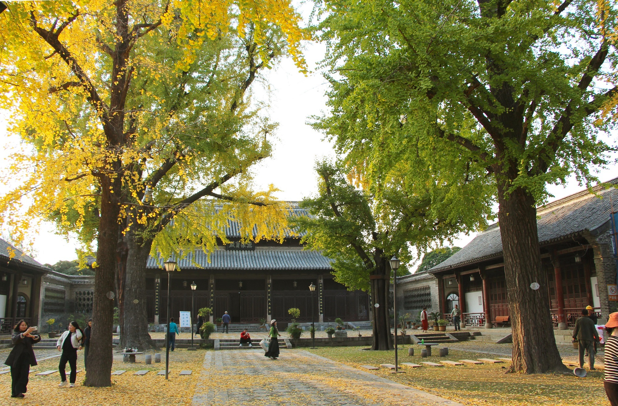 位于古城西街孔庙内的四株银杏,枝叶奇特,挺拔可观,大成殿前的两株参天银杏古树,岿然屹立740多年。饱经风霜、苍劲古拙。