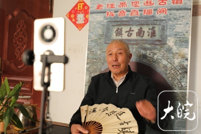汪老家在寿县正阳关镇,他家的客厅有一面背景墙,上面是正阳关古镇南门画面,门头上写有“淮南古镇”四个字,背景墙前面茶台上放着一把已破损了的折扇,上面写着“老汪带您逛古镇”几个字。“我很喜欢这把折扇,这是我们当地一名书法家送给我的,我每次做直播时都拿着这把折扇。”汪老说,背景墙是儿子帮他做的,老伴和儿子都支持他做公益。