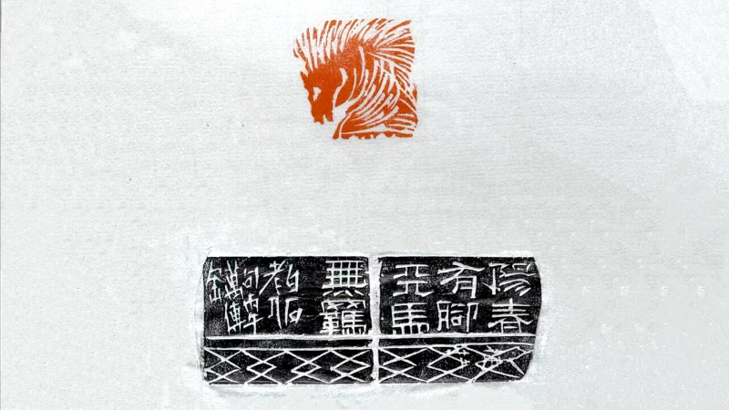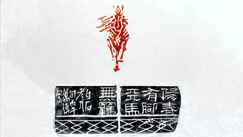 讲好寿县故事,传承古城文化。此次展出的篆刻作品以肖形印“马”为主,有的肥硕雄浑,丰腴而不失奔腾之势,也有的锋棱尽现,劲健内藏。肖形印“红鬃烈马”用刀凌厉,线条纷披,如从历史隧道穿越而来,耳畔似闻八公山谷马蹄声。肖形印“铜车马”拟古取法汉代画像砖,将“丙午大吉”四字巧妙化为车轮,造型生动,雍容华美,尽显楚风汉韵。“一朝奋发千山越,逐日追风万里蹄”——这是“马踏祥云”篆刻的边款,朱墨拓片相映成趣,令人过目难忘。