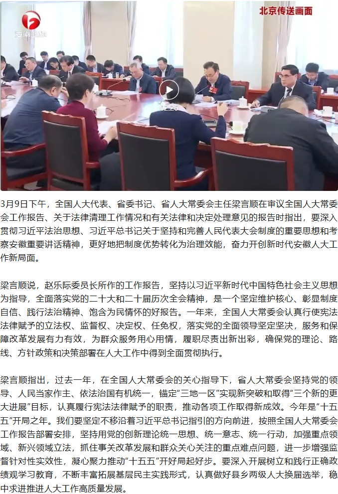 梁言顺在审议全国人大常委会工作报告时指出 更好地把制度优势转化为治理效能 奋力开创新时代安徽人大工作新局面