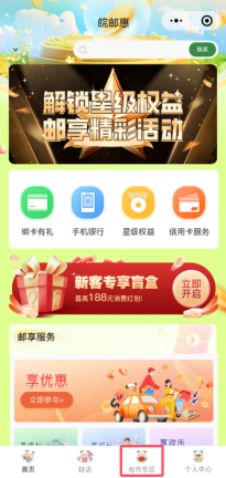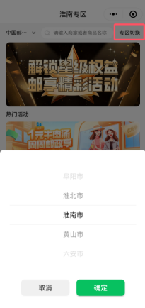 (2)在“皖邮惠”小程序页面下方进入地市专区,选择淮南专区