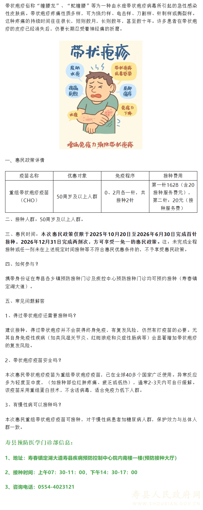 寿县启动重组带状疱疹疫苗惠民政策,最高省1608元!