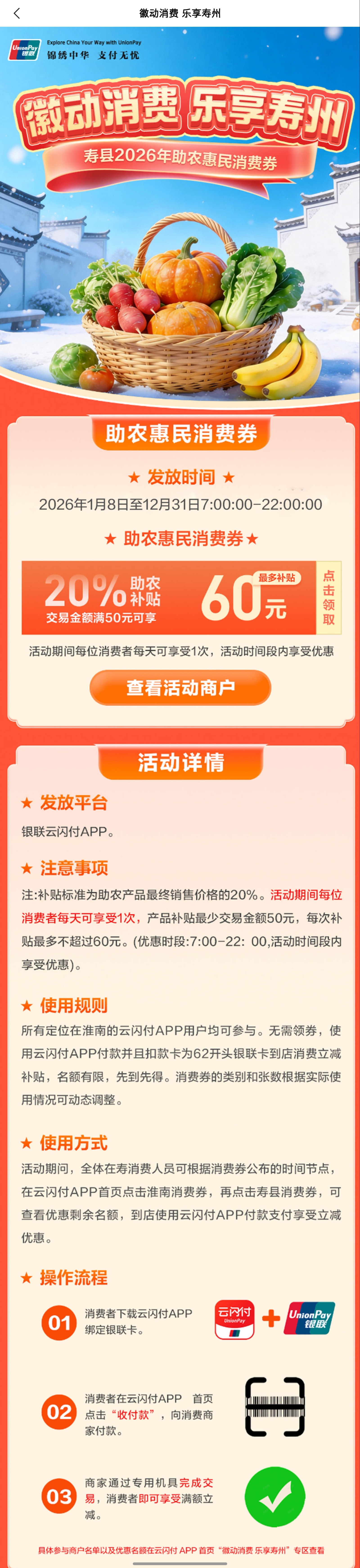 (3)商家收款成功完成交易,消费者即可享受优惠。(具体参与商户名单以及优惠名额在云闪付APP首页“徽动消费 乐享寿州”专区查看)。