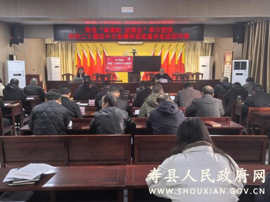 12月17日,寿县“举旗帜・送理论”学习贯彻党的二十届四中全会精神县级宣讲活动走进迎河镇,为迎河镇广大党员干部送上了一场深刻的思想盛宴。县委党校助理讲师、县级宣讲团成员王书媛受邀作专题宣讲报告,镇领导班子成员、各村党总支书记、镇直单位党组织负责人等 50 余人参加会议。